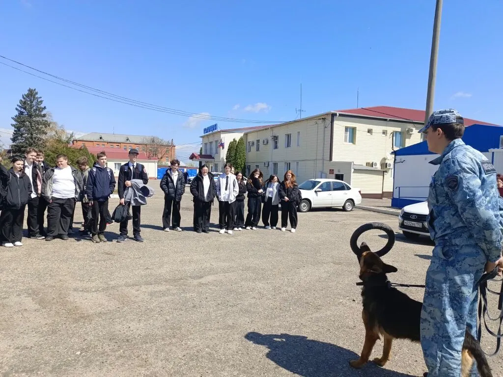 А младший инспектор-кинолог младший сержант полиции Токмоков Н. А. познакомил подростков со своим четвероногим коллегой по кличке «Грейси», которая показала элементы общего курса дрессировки. Инспектор –кинолог рассказал об особенностях дрессуры каждой служебной собаки, после чего даже разрешили погладить одну из собак.